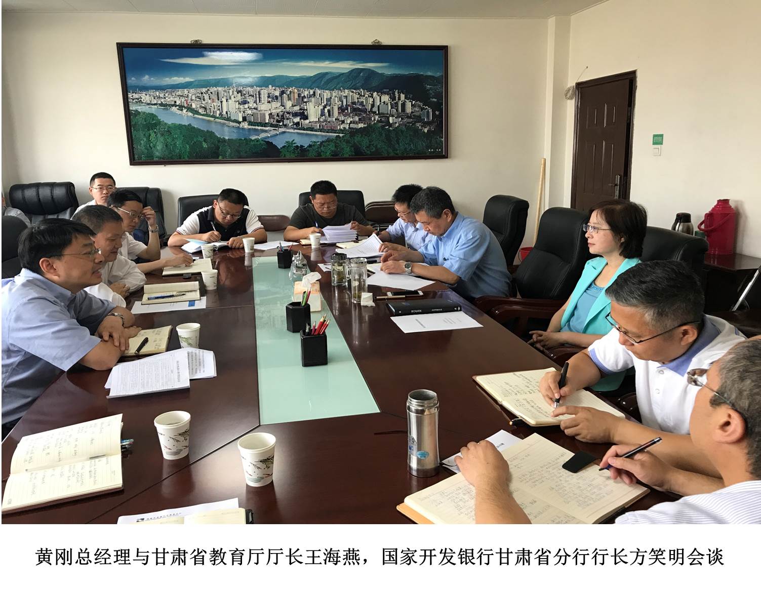 8月11日,黃剛總經(jīng)理與甘肅省教育廳廳長(cháng)王海燕、國家開(kāi)發(fā)銀行甘肅省分行行長(cháng)方笑明在甘肅教育廳舉行了會(huì )談,就進(jìn)一步推動(dòng)教育扶貧工作深入研討,并建立了相關(guān)工作聯(lián)系機制。戰略合作部、網(wǎng)絡(luò )部負責人、省開(kāi)行相關(guān)人員參加了調研與會(huì )談。